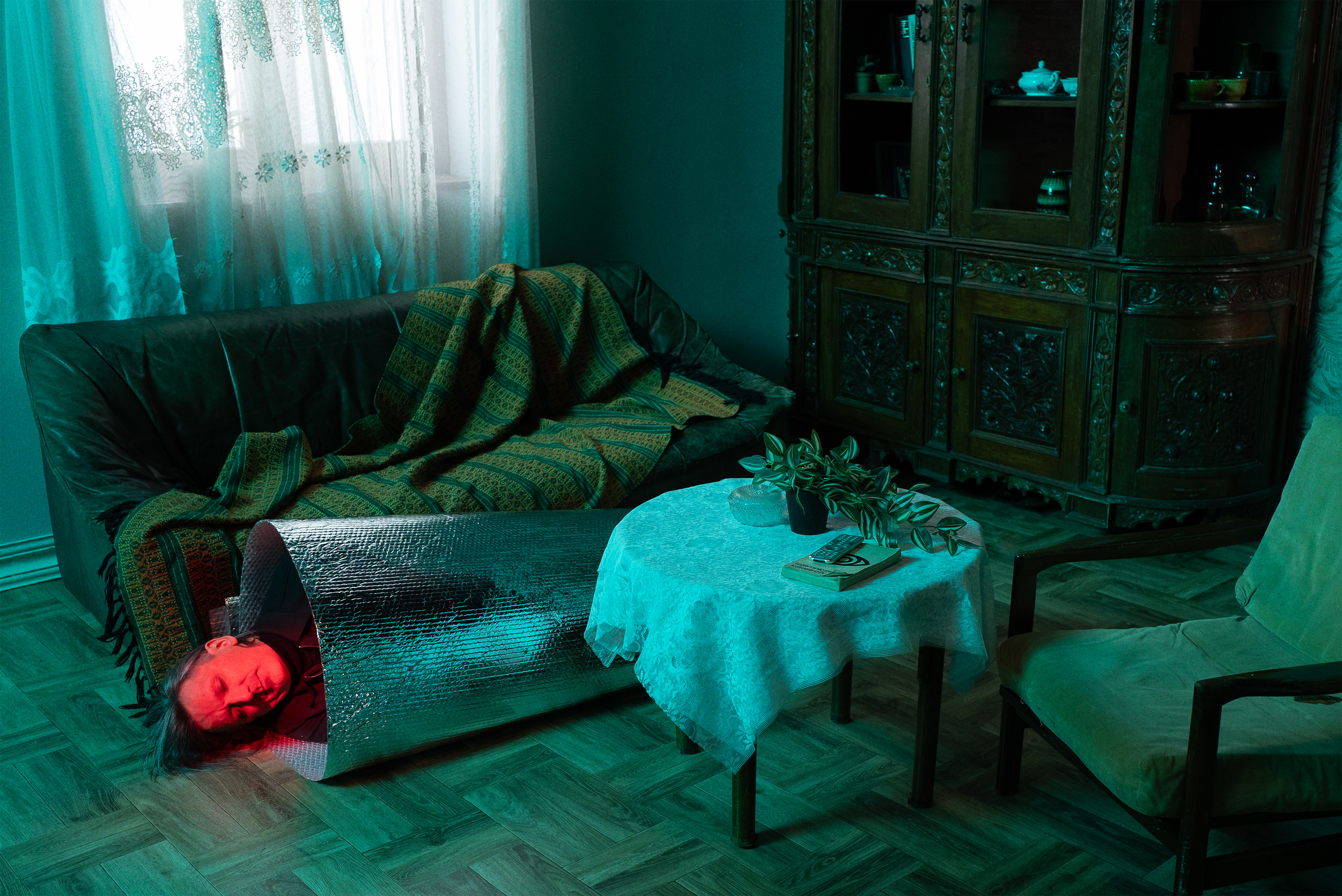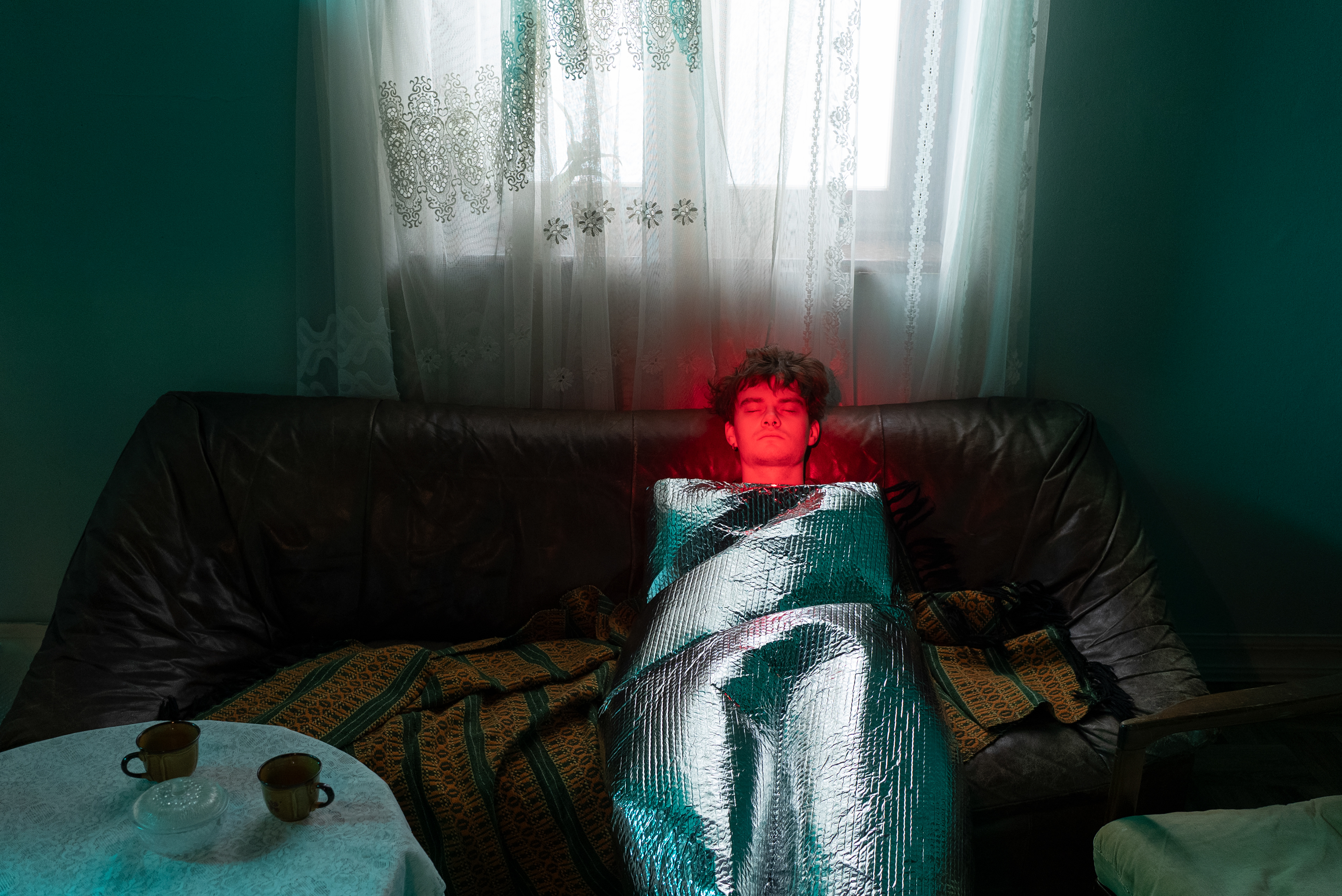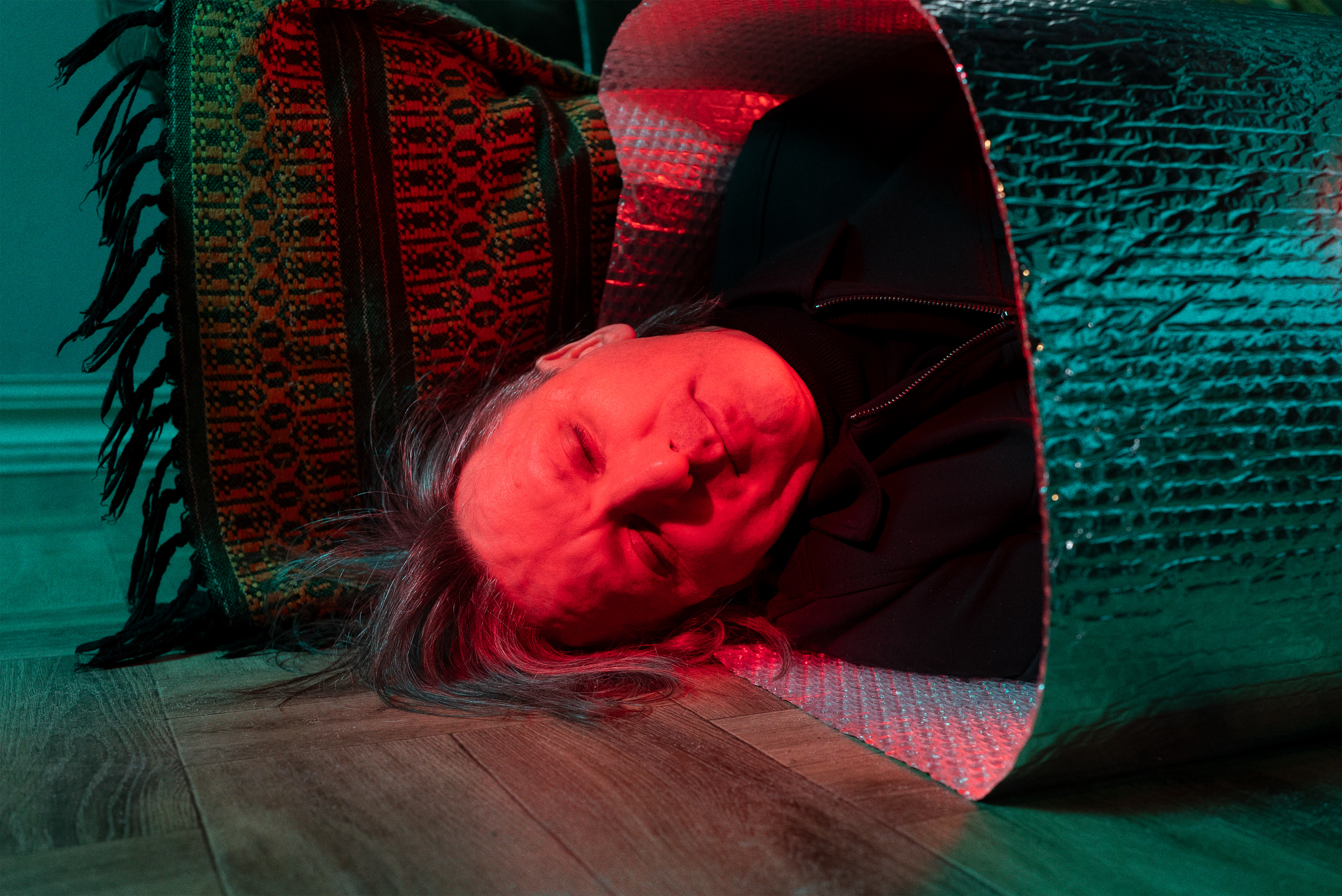 Staged photographic series focused on experimentation with light, color, and form. The human body appears wrapped, isolated, and partially transformed into an object - suspended between presence and absence, personality and depersonalization. The figure evokes associations with a robot, artificial intelligence, or a system placed on hold, waiting for activation. The images reflect a contemporary state of uncertainty, where the boundary between human and non-human becomes increasingly unstable. Identity feels temporary, consciousness paused, as if caught between past definitions and an undefined future. This series explores the tension between control and vulnerability, individuality and erasure, asking what it means to remain human in a time of technological and existential ambiguity.